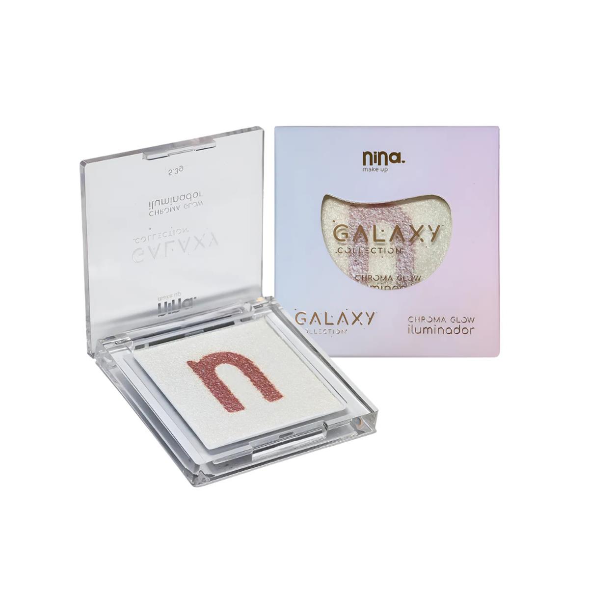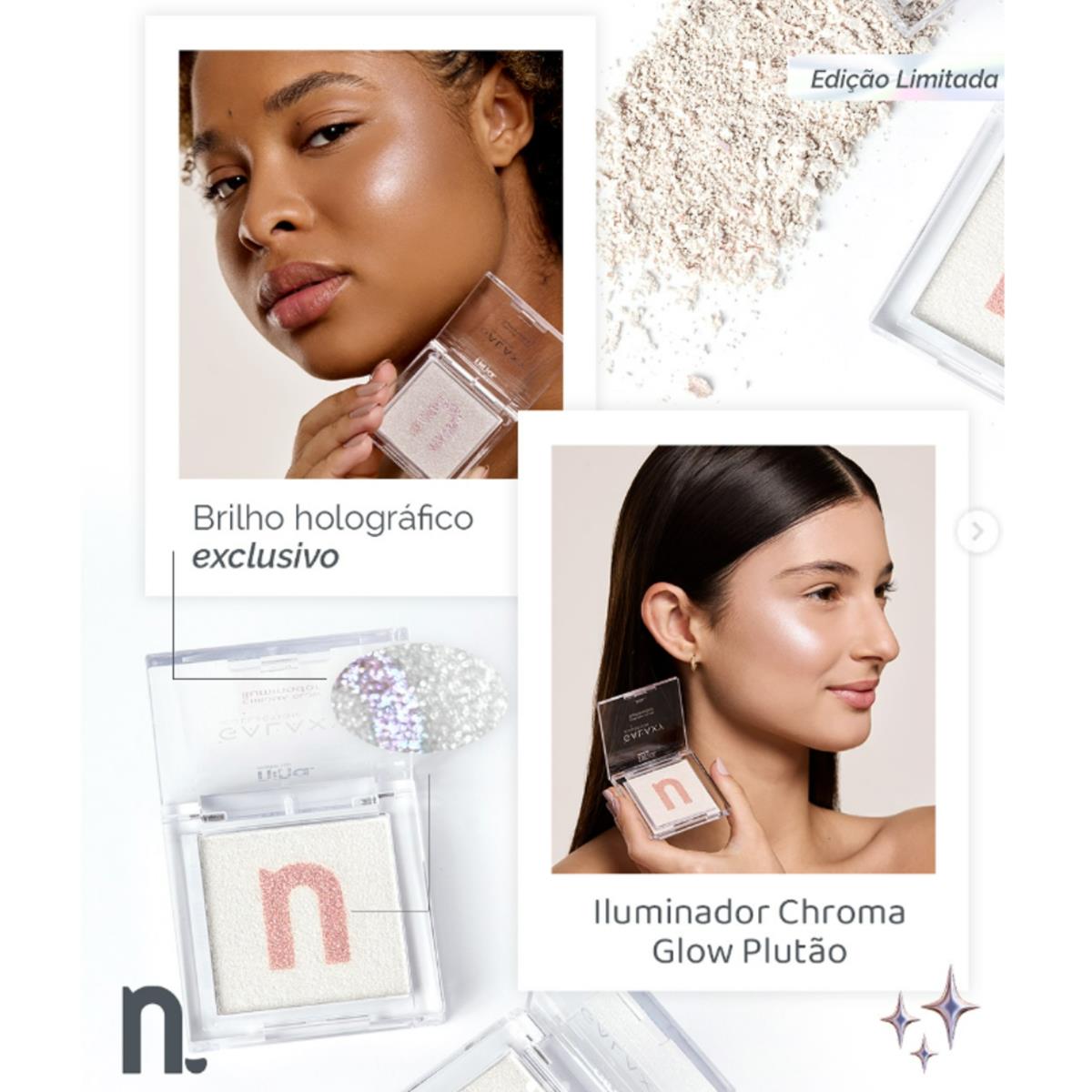 O Iluminador Galaxy Plutão Nina Makeup entrega um brilho holográfico com brilho e fundo perolado, transforma a pele em pura luminosidade.