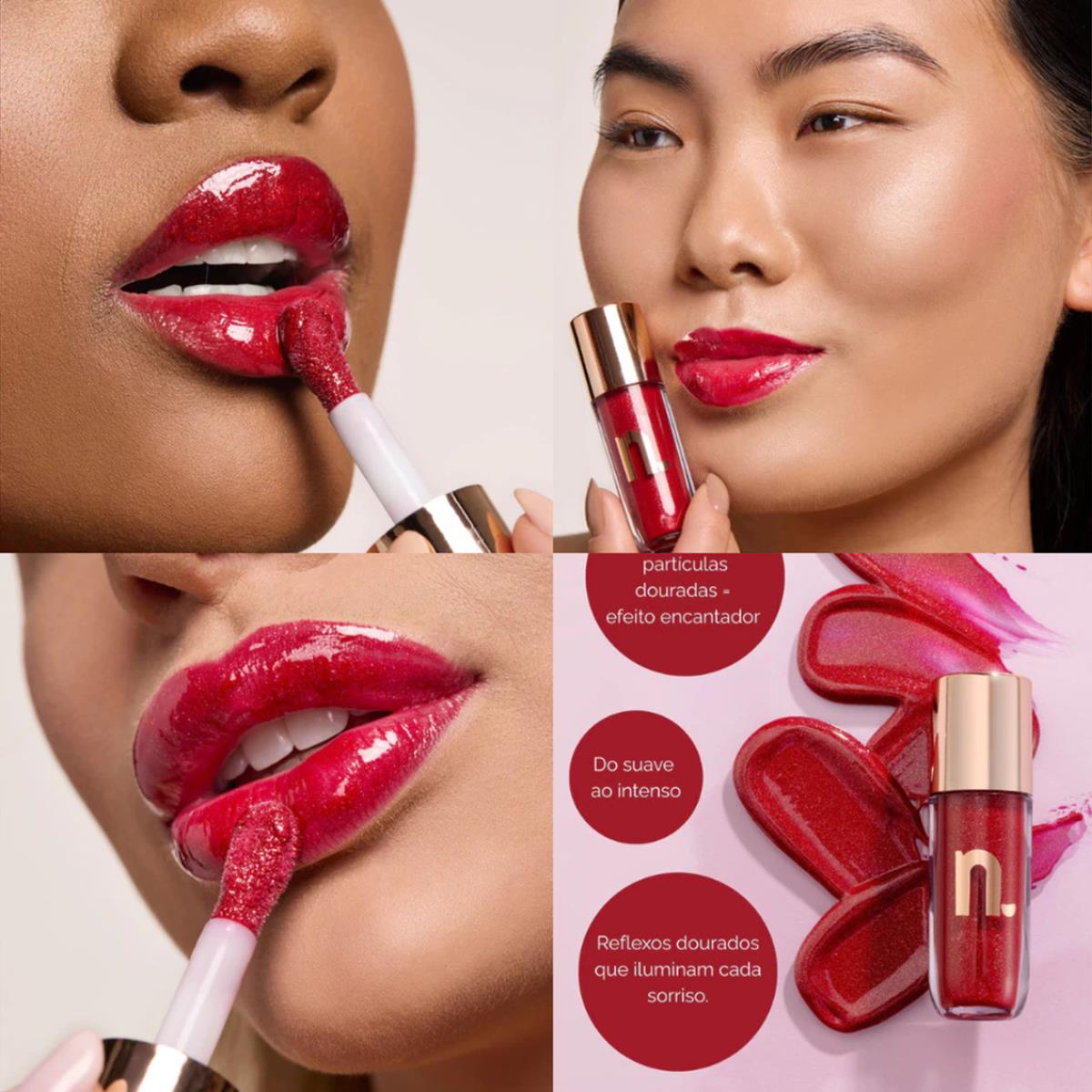 O Gloss Instant Glow na cor Morango do Amor da Nina Makeup chegou aqui na My para deixar seus lábios tão irresistíveis quanto o doce que conquistou o Brasil. Com cheirinho de morango e um tom de vermelho com partículas douradas que refletem a luz a cada movimento, ele entrega brilho intenso, hidratação e um toque de luxo que transforma cada sorriso em puro desejo.
